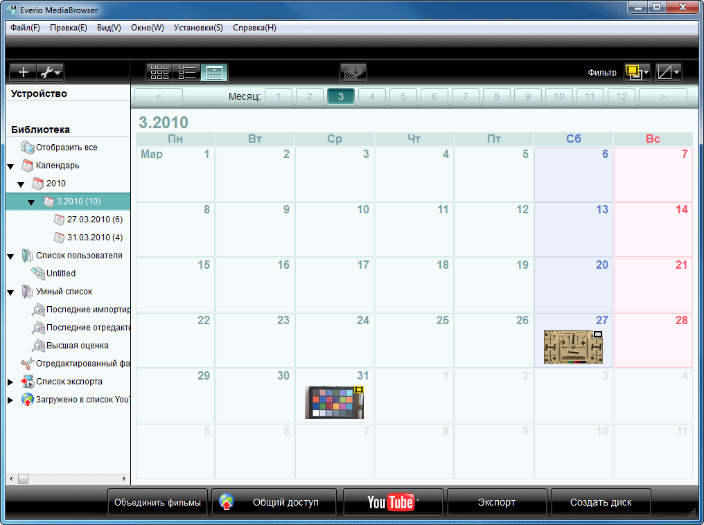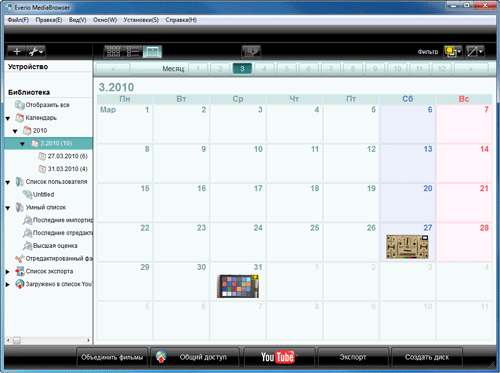 Первый, как нетрудно догадаться, предназначен для управления видеоматериалом: сортировка, просмотр, несложное редактирование и запись DVD-видео дисков. Главное окно программы выполнено в виде модного теперь календаря, где каждой дате соответствует видео, снятое в этот день. Каждому дню отводится также текстовое поле, которое разрешается заплнить кратким текстовым комментарием.