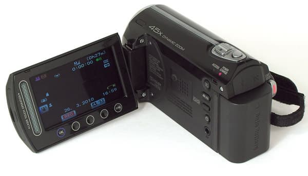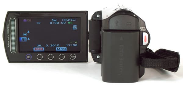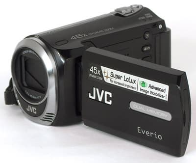 ЖК-экран в видеокамере хоть и широкоформатный, но всё-же ему явно недостаёт пикселей, изображение на нём выглядит зернистым. Рамка у экрана довольно широкая — ну и правильно, ведь органы управления требуют немало места. Кстати, об управлении. В нынешних видеокамерах JVC используется довольно необычная технология (для тех, кто с ней незнаком), в аппаратах других производителей не присутствующая.