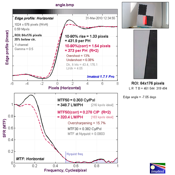 Верхний график представляет собой краевой профиль, для которого приведено значение 10-90% rise distance в пикселях, а нижний график представляет собой MTF (Modular Transfer Function — функция передачи модуляции), для которой приведен параметр MTF50 в циклах на пиксель. Краевой профиль и MTF камеры показаны черной линией. Красной пунктирной линией обозначен краевой профиль и MTF, которые программа Imatest считает близкими к оптимальным. 10-90% rise distance и MTF50 также являются расчетными величинами Imatest.