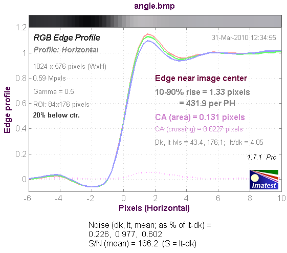 График хроматической аберрации (на самом деле, это тот же краевой профиль, только построенный по каждому цвету в отдельности). При значении параметра CA (area) равным 0-0.5 хроматическая аберрация не заметна.