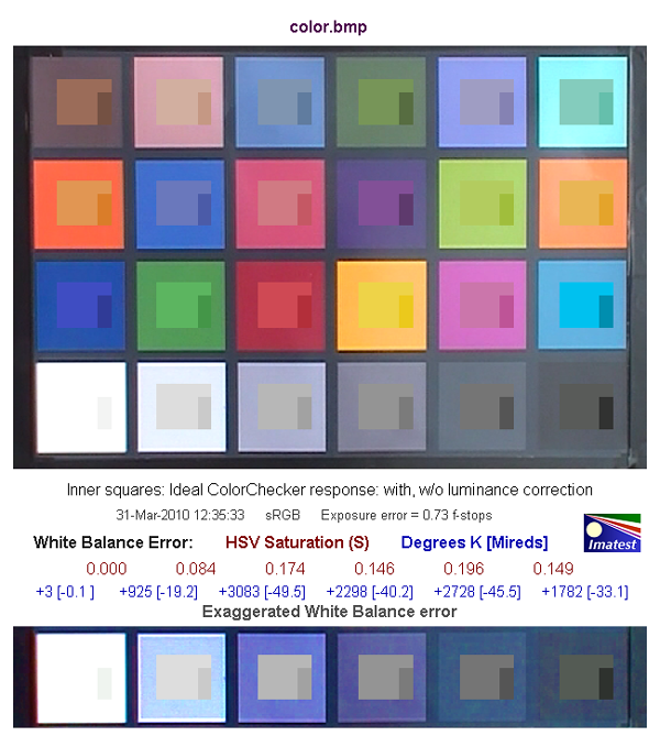 Средняя строчка цифр показывает нам численную оценку ошибки баланса белого в единицах цветового пространства HSV. Так, цифры красного цвета обозначают ошибку по координате S — saturation (насыщенность), цифры синего цвета — в градусах Кельвина [Миредах (Mireds)]. При значении S < 0.02 (речь идет об ошибке по координате S в HSV), ошибка практически незаметна, а при ошибке S > 0.10 она видна, особенно на нейтральных полях большой яркости.