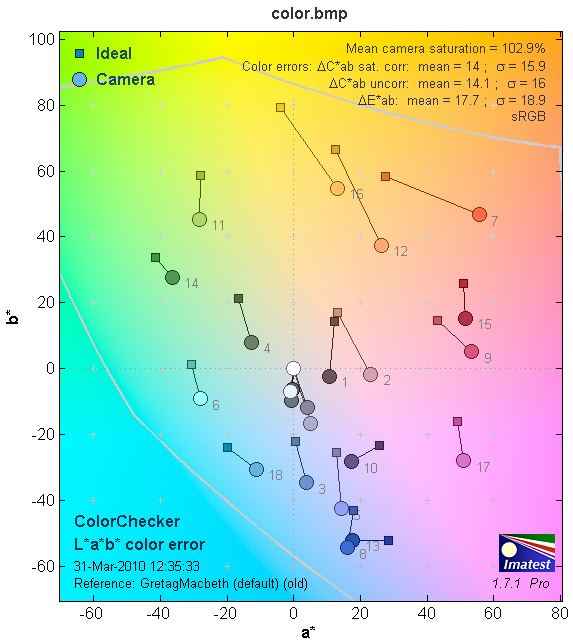 На следующей диаграмме в графической форме представлены отклонения зарегистрированных камерой цветов от идеала в цветовом пространстве CIE LAB. Данная диаграмма отклонения в Lab показывает на сколько камера дает ошибку при передаче цвета.