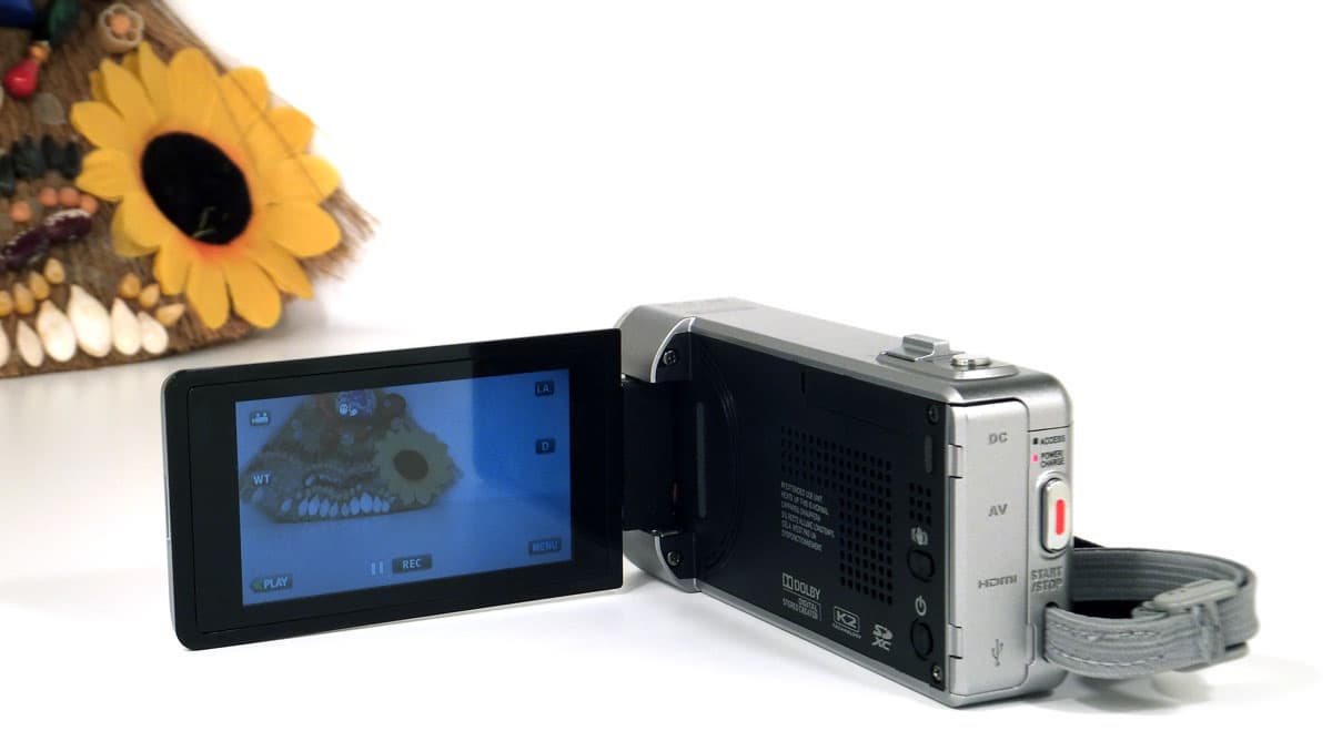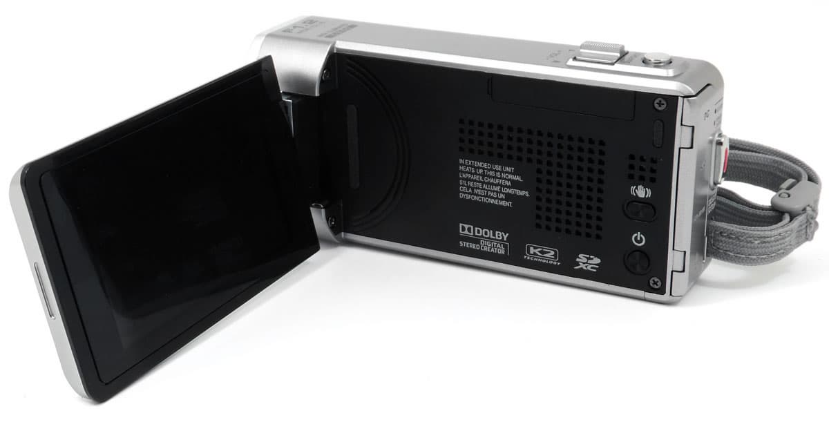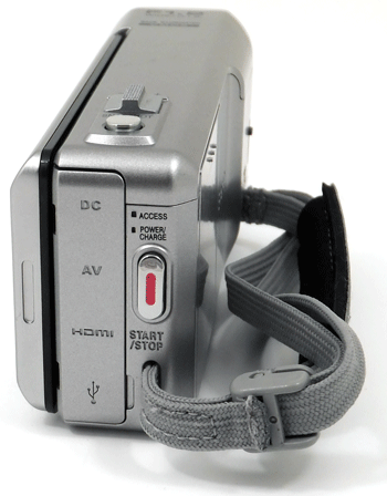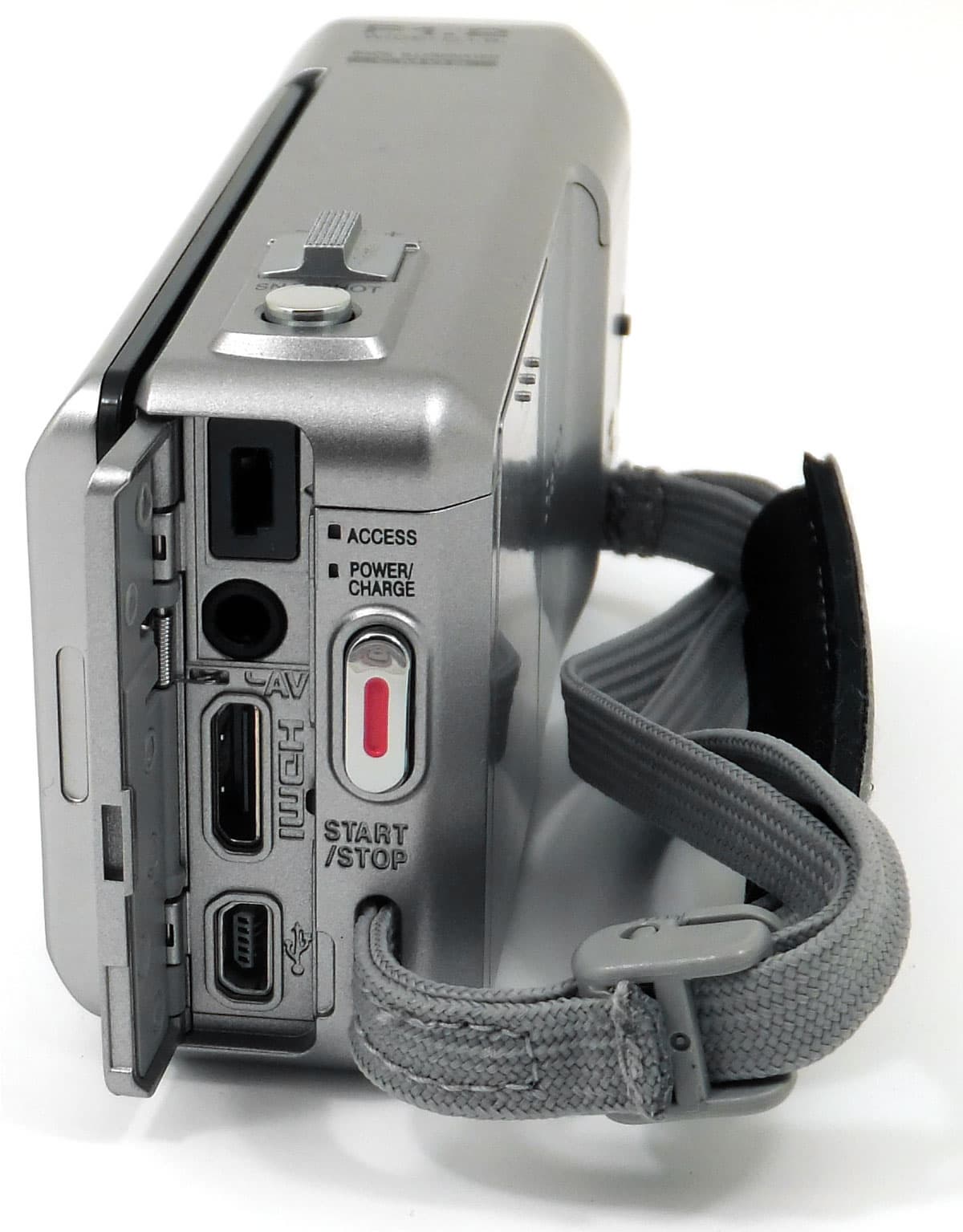 На торце корпуса видеокамеры расположена кнопка записи, индикаторы состояния аппарата и открывающаяся дверка. Под ней спрятаны вход адаптера питания, композитный аудио/видеовыход, HDMI-выход и порт USB.
