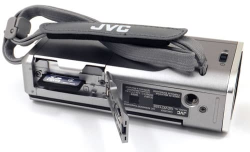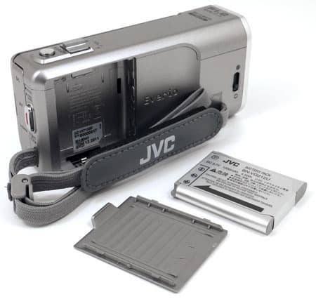 Ремень камеры снабжён дополнительным ремешком, с помощью которого камера крепится на кисть. Здесь же, со стороны ремешка, имеется съёмная крышка, под ней — углубление для установки аккумуляторной батареи. Прилагаемая батарея имеет ёмкость 1200 мА·ч и позволяет вести непрерывную видеосъёмку в режиме XP до 109 минут с работающим ЖК-экраном. Протестировать длительность работы камеры с выключенным экраном не получится: к сожалению, имеющийся в камере режим Silent не гасит ЖК-экран полностью, как это сделано в JVC GZ-GX1. Экран продолжает работать, лишь его яркость, и без того невеликая, снижается до предела, что немного сохраняет энергию батареи (всего на один-два процента). А при закрытом ЖК-экране камера тут же выключается.