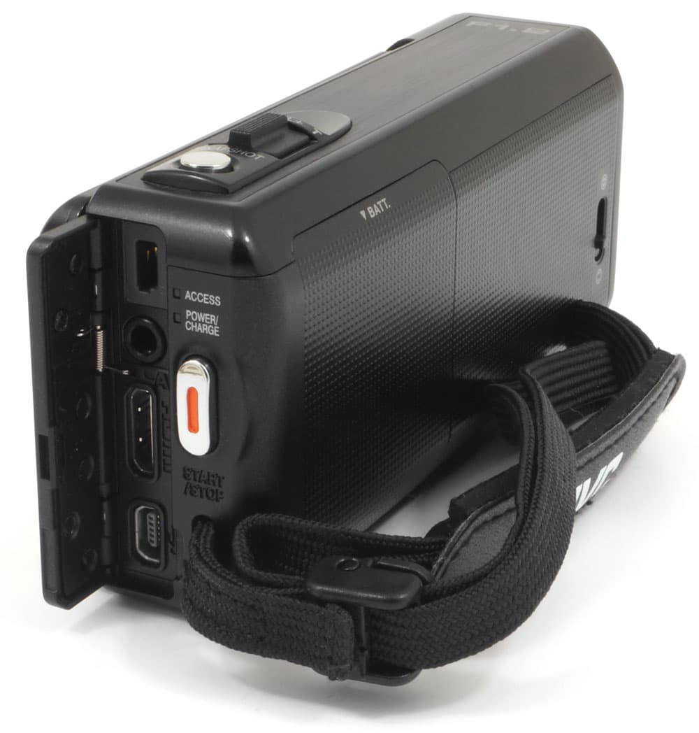 Индикаторы режимов работы и кнопка старт-стоп расположены на привычном месте — торце камеры. В верхней части корпуса, под большим пальцем правой руки, находятся не менее привычные рычажок зума и кнопка, нажатие которой приводит к созданию фотоснимка. Также на торце находится откидная дверка, под которой спрятаны вход адаптера питания, композитный аудио/видеовыход, порты Mini-HDMI и Mini-USB.