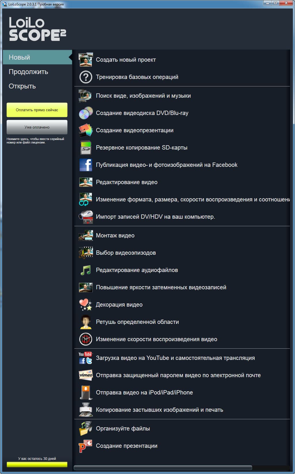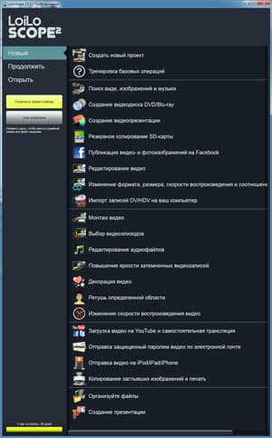 Программа встречает заставкой, где предлагается тут же начать работу над новым проектом либо пройти обучение по основным операциям, возможным в LoiLoScope. А их, операций (точнее, уроков по операциям), на данной заставке насчитывается более двух десятков. Кстати, примечательно, что программа теперь полностью русифицирована.