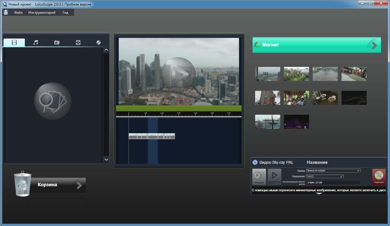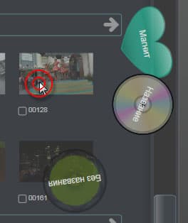 Если же хочется порядка, то получить его можно, нажав на файле правой кнопкой мышки. Тут же появятся пиктограммы с надписями, в сторону нужной пиктограммы следует протащить курсор мыши, не отпуская нажатой кнопки. Именно в «том направлении» отмеченный файл и отправится: либо приклеится к виртуальному Магниту, либо вставится в список файлов, ожидающих прожига на диск, или, наконец, поместится на таймлинию. Надписи на пиктограммах довольно трудно прочитать, поскольку они повёрнуты. Но — дело привычки.