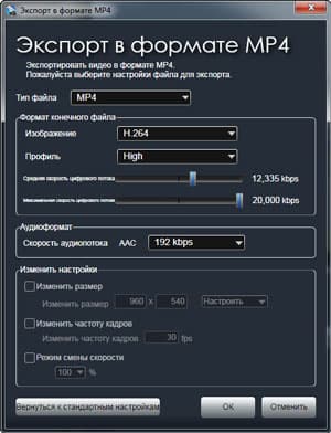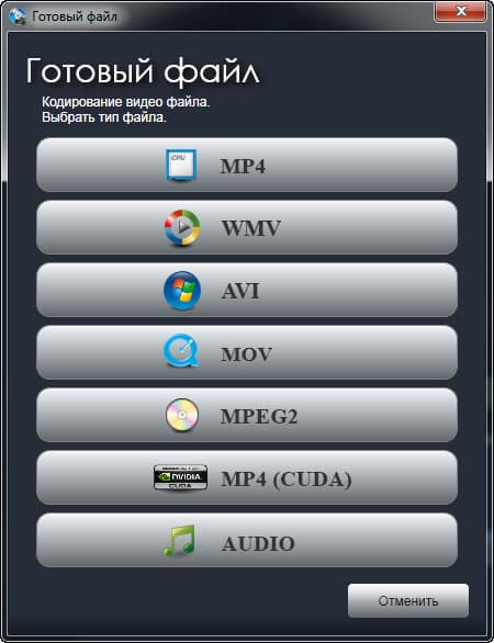 Рассмотрим часть этих пунктов. Экспорт в конечный файл возможен в нескольких вариантах: видео различных форматов и звук (WAV, AAC, WMA). Следует заметить — при наличии видеокарты NVIDIA, поддерживающей архитектуру CUDA, данный список пополняется ещё одним пунктом, который так и называется — MP4 (CUDA).