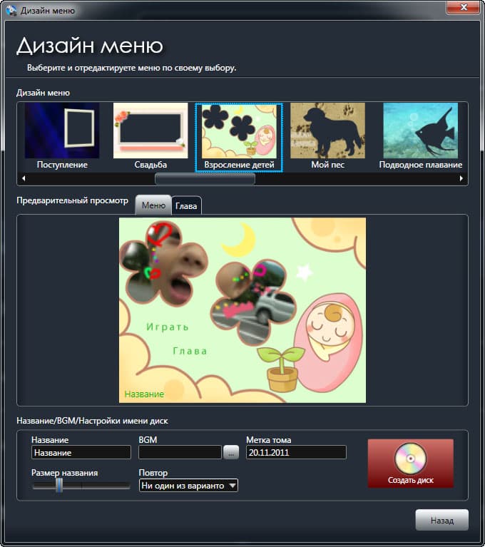 В заключение изучим модуль создания дисков, имеющийся в программе. С его помощью можно «савторить» (см. авторинг) вполне приличного вида произведение, имеющее несложное меню, оформленное по одному из имеющихся здесь шаблонов. К сожалению, шаблоны эти нельзя модифицировать: фон, расположение надписей и объектов неизменяемы.
