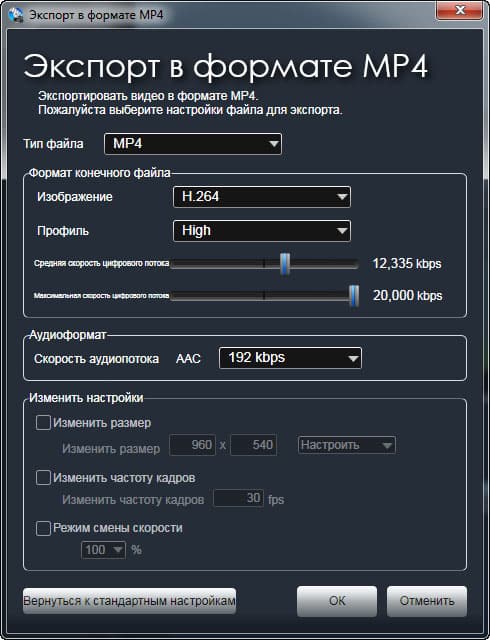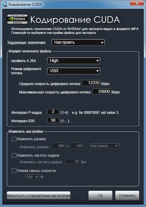 В сравнении с такими настройками параметры сжатия в MP4 выглядят, конечно, бедными. Доступны лишь выбор профиля и битрейта (который зачем-то ограничен 20 Мбит/сек), также регулируется скорость аудиопотока AAC. Памятуя об умении рассматриваемой программы задействовать при кодировании архитектуру CUDA, проведём привычный эксперимент: экспортируем один и тот же проект в H.264, сначала с видеокартой AMD, а затем — с NVIDIA. Обратите внимание: при использовании CUDA параметры экспорта пусть незначительно, но различаются: