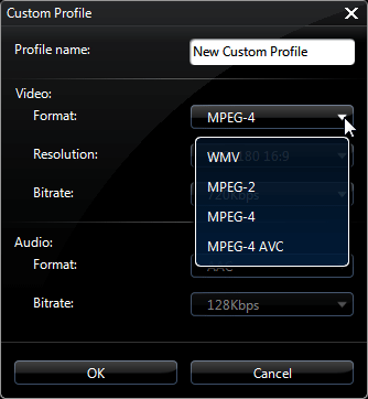 Позволяется создавать собственный пресет (заготовку), но и в этом случае выбор ограничивается лишь четырьмя форматами: WMV, MPEG-2, MPEG-4 и AVC.