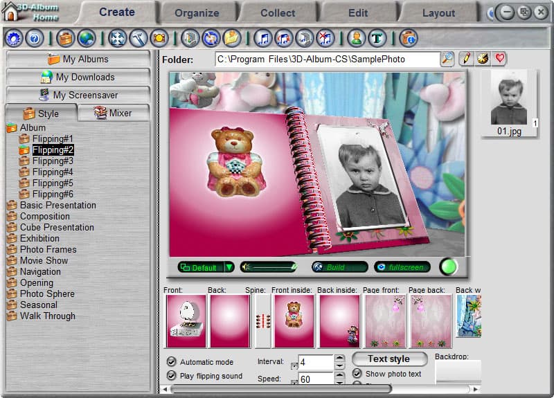 Продолжаем накапливать материал: требуется раздобыть футаж, содержащий нечто похожее на перелистывающийся альбом. Такой альбом можно снять и самостоятельно видеокамерой, но не возбраняется использовать и полуготовые решения. Так, в нашем случае в самую пору оказалась программа 3D Album, хотя при желании можно найти что-то более гибкое и современное. Как видно на рисунке ниже, первая фотография уже "вклеена" в альбом — в 3D Album это делается одним щелчком мыши.