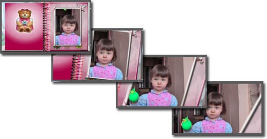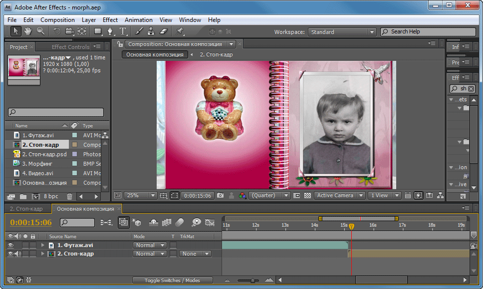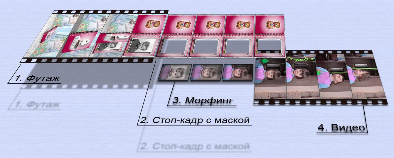 Простейшая схема: вначале проигрывается футаж с перелистывающимся альбомом (1). Затем одновременно проигрываются два слоя: стоп-кадр с раскрытым альбомом, где фотография вырезана с помощью маски, и видеоряд, содержащий морфинг (2-3). Завершает всю конструкцию живое видео (4). Правда ведь — несложно?