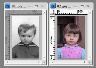 Загрузим два имеющихся у нас снимка (старое фото и стоп-кадр из видео с малышкой) в графический редактор, поддерживающий работу со слоями. Здесь эти рисунки нужно совместить так, чтобы основные черты лиц и фигур как можно больше совпадали по размеру, положению и наклону (прозрачность верхнего слоя на время работы можно уменьшить до 60-80%).
