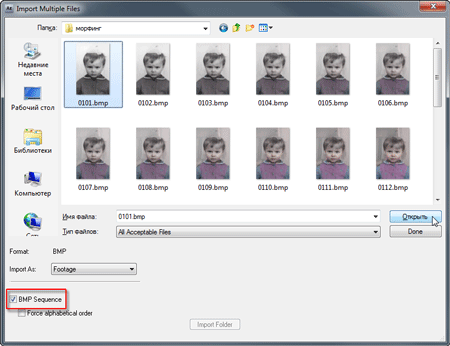 Таким образом, в проект необходимо импортировать четыре перечисленных выше объекта. При этом результат морфинга (последовательность из 25 bmp-картинок) требуется импортировать с помощью команды File->Import->Multiple Files (Ctrl-Alt-I). Убедитесь, что параметр BMP Sequence активирован флажком.