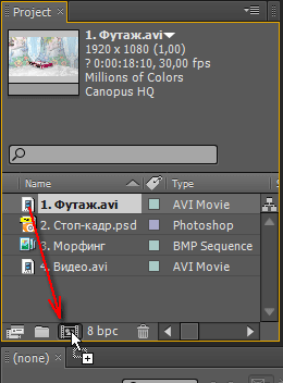 Итак, теперь в копилке проекта имеются искомые четыре объекта, с которыми мы и станем работать. Первым делом перетащите файл 1.Футаж.avi (видео с перелистывающимся альбомом) на значок создания новой композиции.