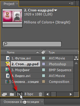 Теперь перетащим стоп-кадр из альбомного футажа на тот же значок создания новой композиции.