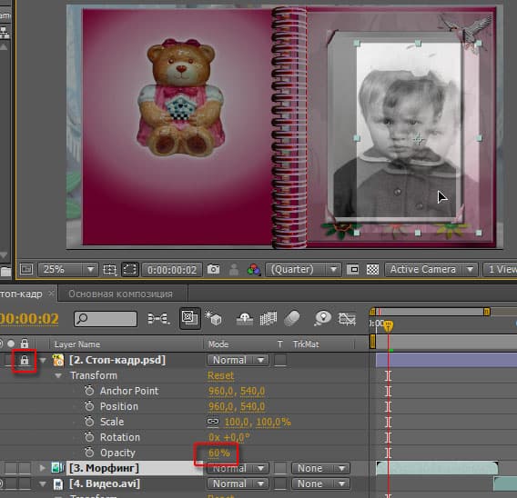 Следующим шагом будет перемещение слоя 3.Морфинг и его подгонка точно по размерам фотографии в альбоме. Для этого нужно уменьшить прозрачность верхнего слоя 2.Стоп-кадр.psd, а затем заблокировать его от случайного сдвига. Теперь перетащите слой 3.Морфинг по экрану и совместите его с фотографией. Для более точного позиционирования можно увеличивать или уменьшать масштаб отображения кадра в окне монитора -это очень просто делается поворотом колеса мышки.