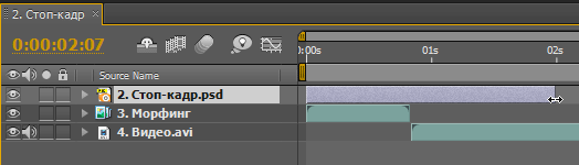 Появившаяся вторая композиция автоматически получила имя 2. Стоп-кадр. Увеличим её длительность так же, как мы это недавно проделали с Основной композицией. Теперь перетащим на таймлинию недостающие элементы, а именно последовательность кадров 3.Морфинг и собственно финальное видео 4.Видео.avi. Как видно на рисунке, слой 3.Морфинг должен быть расположен строго под слоем 2.Стоп-кадр.psd, а длительность проигрывания верхнего слоя нужно увеличить хотя бы до пары секунд, зацепив его край мышкой и перетащив вправо.