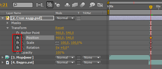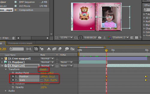 Следующий шаг — совмещение финального видео с последним кадром морфинга. Установите ползунок времени в последний кадр слоя 3.Морфинг, выделите слой 4.Видео.avi и нажмите на пиктограммы-часики параметров Position и Scale. Мышкой переместите слой 4.Видео.avi, при необходимости изменив его размеры, и "подгоните" изображение. Как только вы это сделаете, на таймлинии появятся ключевые точки — в них записана информация о положении и размере слоя 4.Видео.avi. Теперь прокрутите ползунок времени по таймлинии до отметки в 2 секунды и щелкните по слову Reset в параметрах слоя на таймлинии. Появившиеся еще две ключевые точки содержат информацию о прежнем положении и размере слоя, т.е. таких, которые он имел по умолчанию.