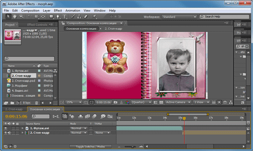 Вся последующая работа будет проводиться в нескольких программах самого разного назначения — без этого невозможно изготовить материалы, которые понадобятся при "сборке" всего проекта. Поскольку от качественных исходников зависит добротность конечного результата, то и работа предстоит непростая. Если вам не требуется "вклеивать" фотографии в альбом, не нужно точное совмещение морфируемых объектов — просто не обращайте внимания на соответствующие этапы работы.