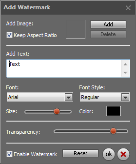 Вторая кнопка — Add Watermark — запускает модуль наложения на видео графического объекта с регулируемой прозрачностью (импортируются форматы BMP, статичный GIF, JPG и PNG) и даже текста, созданного с помощью этого же модуля (кириллица поддерживается). Проще говоря — этот модуль можно (и нужно) использовать для наложения на видео статичных логотипов.