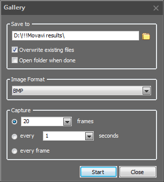 Окно с заголовком Gallery содержит инструменты, с помощью которых настраиваются параметры создания стоп-кадров. Форматы, в которые они сохраняются, нам уже знакомы — всё те же BMP, GIF, JPG и PNG. А вот выбор степени дискретности (интервалов сохранения) здесь поистине широк: от покадрового сохранения до сохранения через произвольное количество секунд.