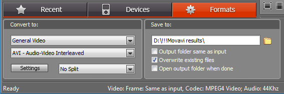 Но пора переходить к основному богатству: форматам кодирования. Выбор их осуществляется в нижней части рабочего пространства. Здесь расположено окно, состоящее из трёх вкладок: Recent (где накапливаются последние выбранные пользователем форматы), Devices (со списком форматов, подходящих для проигрывания аппаратными плеерами), и Formats.