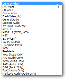 Главное во вкладке Formats — выпадающий список, в котором содержится тотальное количество доступных форматов. Охвачено всё, что только существует сегодня — от всех форматов видео до всех форматов аудио (имеются в виду, конечно же, реально встречающиеся форматы, а не закрытые и мало кому известные разработки).