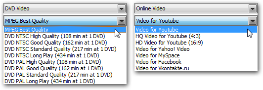 Но самое вкусное — дополнительный выпадающий список, расположенный чуть ниже основного. В нём присутствуют пресеты (presets, заготовки) разновидностей каждого формата. Например, формат DVD Video подразделён на девять заготовок, каждая из них снабжена поясняющими надписями (количество минут видео на одном DVD-диске). Формат Online Video подразделяется на семь заготовок, каждая соответствует требованиям определённого веб-сервиса (забавно, даже vkontakte.ru тут присутствует — ау, где вы, отечественные видеоблогеры?).
