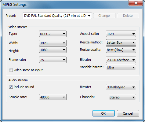 - MPEG-2 720x576, 25 кадр/сек, битрейт видео 9200 Кбит/сек; звук MPEG-2 стерео с битрейтом 224Кбит/сек;
