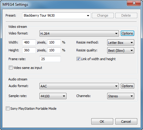 Нетрудно догадаться — она открывает окно детальных настроек выбранного пресета. Один внимательный взгляд, и становится понятно, что в данном окне можно кардинально перепотрошить выбранный пресет: увеличить размер кадра до FullHD, битрейт аж до 23000 Kbit/sec, изменить метод изменения размера и т.д.