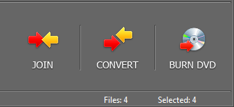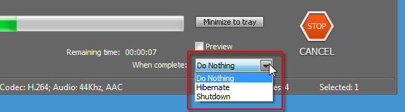 Нажатие первой кнопки — JOIN — заставит программу начать конвертацию всех выбранных файлов с одновременным склеиванием, сшиванием их в один результирующий файл. Вторая кнопка — CONVERT — запускает процесс обычной конвертации, когда каждый файл конвертируется по отдельности. Во время кодирования в появившемся выпадающем списке можно выбрать один из вариантов поведения программы: — не производить никаких действий по окончанию кодирования; — усыпить компьютер; — выключить компьютер.
