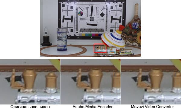 Как видим, Adobe Media Encoder, кодирующий силами центрального процессора, оказался даже медленнее Movavi Video Converter-а. Чуть-чуть, совсем незначительно, но всё же — медленнее. Может быть, он более тщательно кодирует? Более качественно? А ну-ка, проверим!