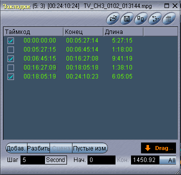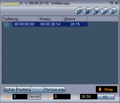 В колонке Таймкод указывается временная метка, с которой ассоциирована данная закладка. В колонке Конец указывается таймкод либо конца клипа (если закладка всего одна), либо таймкод до следующей закладки. Колонка Длина показывает продолжительность видео, начиная от данной закладки и до следующей (или до конца клипа, если закладка одна). Помните, что в цифрах таймкода первая группа справа указывает текущий кадр (фрейм) в данном клипе (а не секунды, как может показаться), вторая группа показывает секунды, третья — минуты, четвертая — часы.