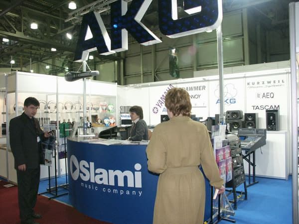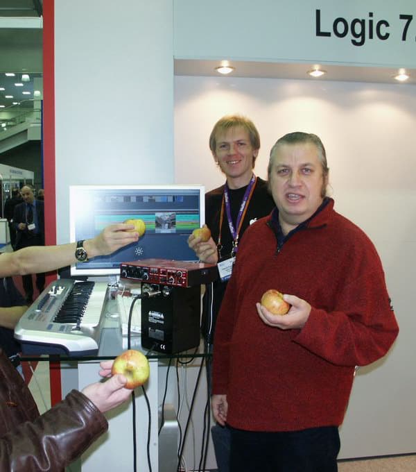 На стенде Apple IMC можно было увидеть приглашенного специалиста из Roland Сергея Бударина, демонстрирующего свежайшую версию музыкального софта Logic 7 и... яблоки, которые успешно поедались посетителями и работниками соседних стендов, включая известного музыканта и аранжировщика Алексея Алимкина.