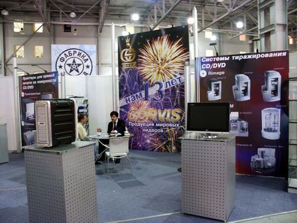 Стенд фирмы "CORVIS", украшенный штендером "нам 13 лет", содержал несколько приметных экспонатов. Один из них, напоминающий гибрид принтера с пишущим CD/DVD приводом, служил логическим дополнением тиражного комплекса для мелкосерийного производства дисков с 8 драйвами. Сейчас значительно возрос интерес к компактным системам тиражирования, очевидно, не без помощи видеопиратов.