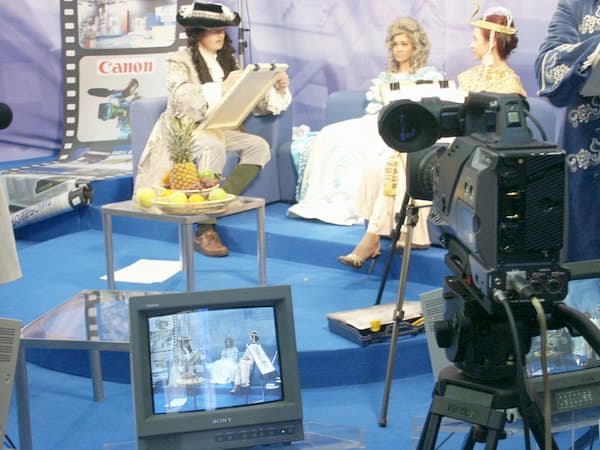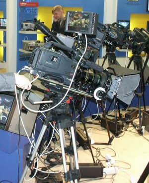 Конечно, на выставке с большим размахом были представлены видеокамеры любых размеров и форматов, в этот раз буквально все экспоненты использовали одинаковую схему - ярко освещенный объект и вокруг него на штативах камеры с индивидуальными мониторами, чтобы можно было непосредственно сравнить картинку. В качестве объекта съемки Panasonic использовала уменьшенную копию мотоцикла и цветы, Sony - игрушки, Окно-ТВ - одетых под екатерининскую эпоху художников и позёров в приятном интерьере.