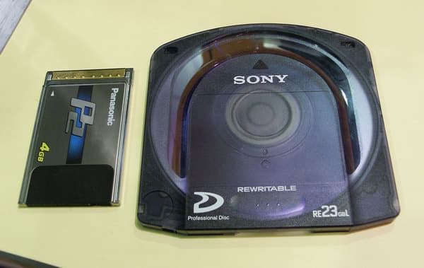 Здесь следует подробнее рассмотреть два подхода, тем более что под них уже создана необходимая съемочная и монтажная инфраструктура. Формат Sony под названием Professional Disk использует односторонний blue-ray диск диаметром 12 см и емкостью 23 Гб, заключенный в картридж, съемочный формат называется XDCAM и сейчас есть 2 модели камер, работающих в нём (одна снимает ещё и в IMX). Емкости диска хватает на 85 мин. записи в DVCAM и на 45 мин. в MPEG IMX.
