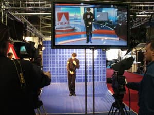 Опередив подмосковную компанию ЭРА, всегда показывавшую какие-либо шоу, фирма "Студия-Сервис" продемонстрировала возможности так называемой "виртуальной студии", в которой снимаемый человек с небольшой временной задержкой оказывается наложенным на любой рисованный фон. Сетка на синем заднике позволяет системе отслеживать перемещения и наезды камеры и очень точно совмещать живой и искусственный слои.