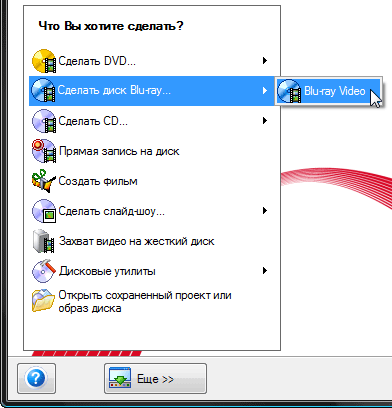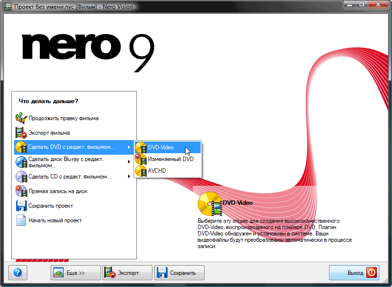 Такое ощущение, словно мы опять вернулись к самому началу работы — перед нами всё то же стартовое окно с выбором операции. Но это не так. Здесь предлагается на выбор несколько вариантов завершения работы: экспорт фильма в файл, создание DVD, AVCHD, Blu-ray дисков.