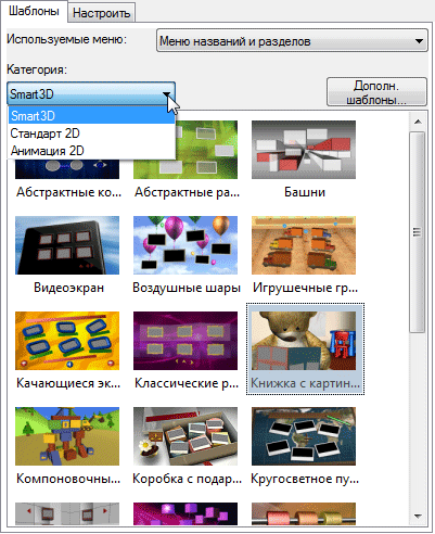 И снова попадаем в уже знакомое окно выбора шаблона. Здесь, как видим, доступны ровно те же шаблоны, что и в случае с обыкновенным DVD.