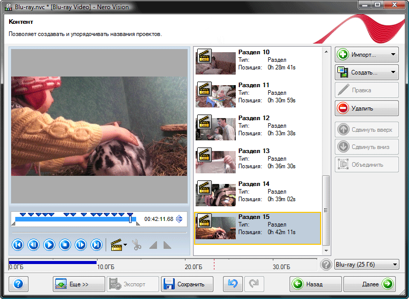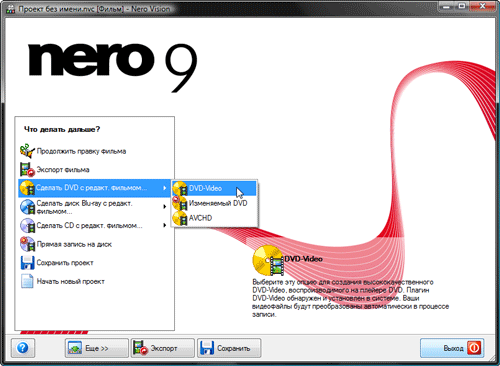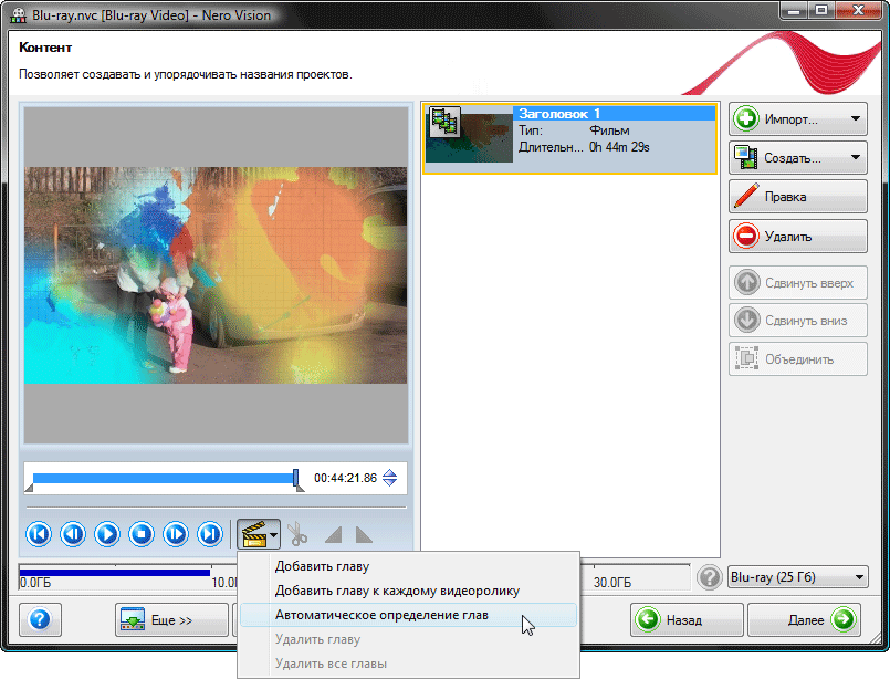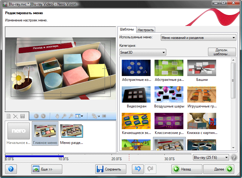Если монтаж в Nero Vision удался без приключений, вы довольны результатом и хотите сделать полноценный DVD-видео или Blu-ray диск, пора перейти к авторингу. Благодаря wizard-подобной модели работы (видите кнопку "Далее", расположенную в правом нижнем углу программного окна?), мы имеем возможность пошагово сделать всю работу.