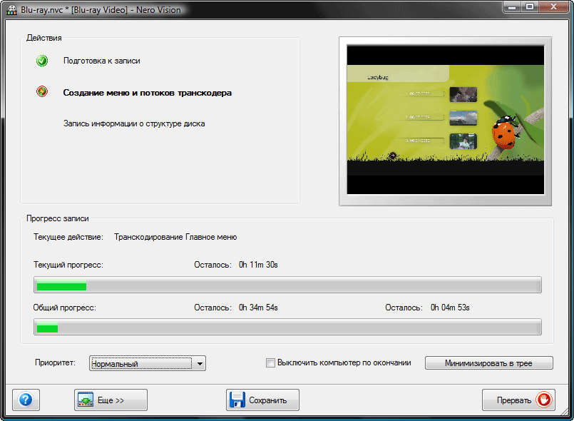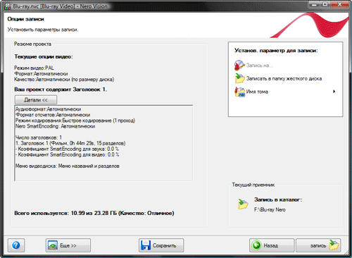 Вот типичный пример: взгляните на рисунок ниже, и обратите внимание на краткий отчет о работе, которую программа собралась выполнять. Перед нами — заключительный этап создания Blu-ray диска с меню.