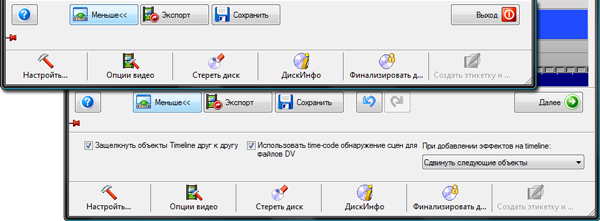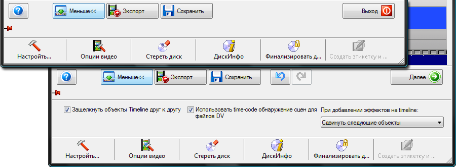 Данная кнопка раскрывает дополнительные инструменты и возможности. Эти инструменты могут быть разными, в зависимости от того, на каком этапе работы находится пользователь (захват, монтаж или авторинг).