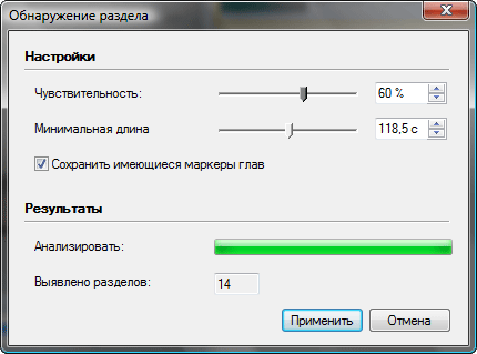 Процедура эта довольно долгая (как, впрочем, и все операции, производимые в Nero 9), процессор загружен полностью так, что параллельная работа в системе крайне затруднена. Непонятно, куда выделяется столько ресурсов, ведь поиск смены сцен в фильме — задача достаточно тривиальная для того, чтобы производить её даже в фоне. Но в итоге программа всё же обнаружила определенное количество сцен и расставила по ним главы (здесь они почему-то называются то главами, то разделами).