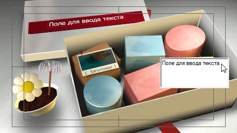 Все текстовые объекты, присутствующие в шаблоне — редактируемые. Двойной щелчок по такому объекту открывает небольшое окно, куда можно ввести свой собственный текст. При этом вводимые символы тут же отображаются в окне просмотра. Положение объектов изменить невозможно, да впрочем, понятно, почему: они должны быть жестко привязаны к псевдо-3D фону.