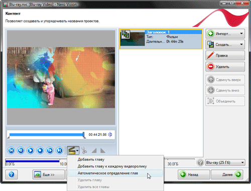 Результат его работы — те же 14 глав (ну конечно, ведь содержание таймлинии не менялось). Справа от окна монитора находится список вех глав фильма, щелкая по каждой, можно перемещаться от одной к другой. Если главы расставлены правильно, жмем "Далее".