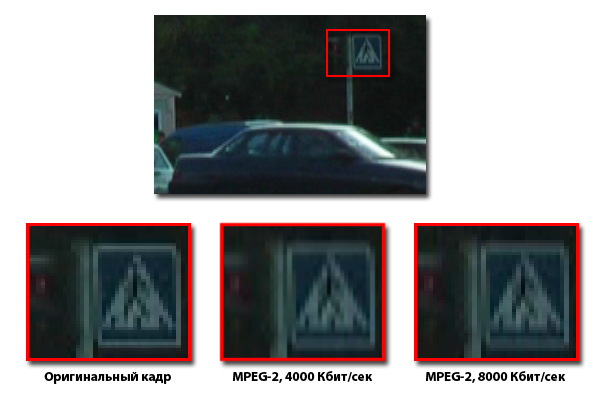 И снова - "мыло". На рисунке ниже видно, как некоторые пиксели, которые были отчетливо видны в оригинальном кадре, размылись, "усреднились", при этом размытие больше произошло по вертикали — видите, как горизонтальные линии (края дорожного знака) стали толще в три раза?