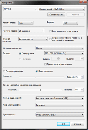 В заключение исследуем, насколько качественно кодирует Nero Vision. Рассмотрим самый распространённый и злободневный на сегодняшний день вариант: кодирование в MPEG-2, пригодного для изготовления DVD-video. В качестве исходного файла возьмём DV-AVI PAL 720x576 с соотношением сторон 16:9. Экспортируем его в MPEG-2 со следующими настройками, взятыми по умолчанию: